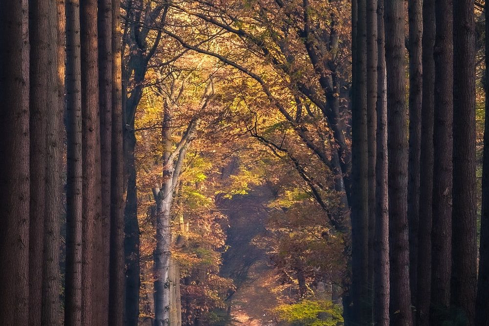 Es gibt hohe Bäume und niedrige Bäume. Es gibt Nadelbäume und Laubbäume. In dieser Spur gibt es beides. Sie gehen durch die dunkle Kathedrale in das bunte Licht des Herbstes.