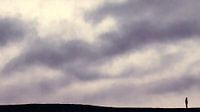 Diese stark minimalistische und atmosphärische Komposition erzeugt ein tiefes Gefühl von Einsamkeit und Unendlichkeit. Das Bild wird von einem dramatischen, weiten Himmel dominiert, der fast die gesamte Fläche einnimmt. Die tief hängenden Wolken sind in gedämpften, kühlen Tönen von Purpur-Grau und hellem, fast cremigem Weiß gehalten und…