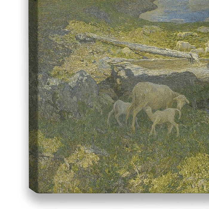 Die Alm ist Segantinis letzte monumentale hochalpine Szene aus seiner Zeit in der Region Savognin in Graubünden. Um diesen See einzufangen, wanderte er jeden Tag mehrere Stunden lang, dennoch hat er die Natur in diesem Gemälde nicht annähernd kopiert, tatsächlich findet man diesen weiten Raum, die weite Landschaft oder die Bergkette nicht, wenn man diesen Ort besucht. Segantini hingegen vereint all diese Elemente zu einem majestätischen, fast kosmischen Weltbild. Brüche von Licht und Schatten unterstreichen das Querformat der Komposition. Ein in Sonnenlicht getauchter Bergrücken erstreckt sich über die gesamte Breite und vermittelt den Eindruck der Unendlichkeit - und gleichzeitig die Bedeutungslosigkeit des Menschen. Die Härte und Strenge der Natur spiegelt sich in der Gestalt des erschöpften jungen Hirten wider, die vibrierende Heide breitet sich über Tiere und Vegetation aus.