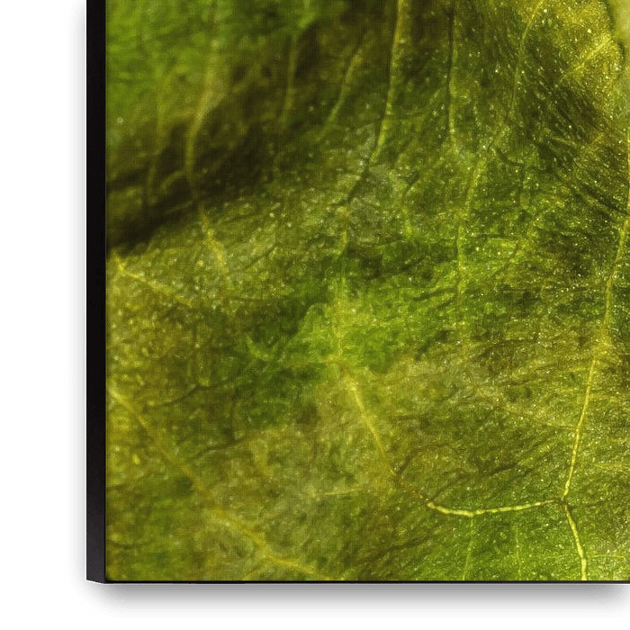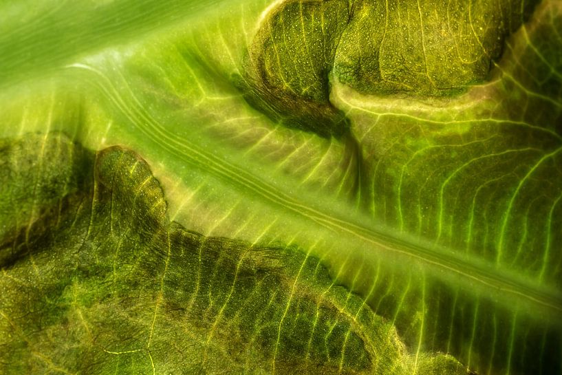 Wie ein Gletscher, der die Berge hinuntergleitet, so sind die Adern des Blattes der Elefantenohrpflanze (Alocasia) geformt. Mit dem Makroobjektiv aus nächster Nähe fotografiert, ist dies ein wunderschönes Stück moderner Kunst. Der Betrachter wird innehalten und sich wundern, was er da eigentlich sieht.