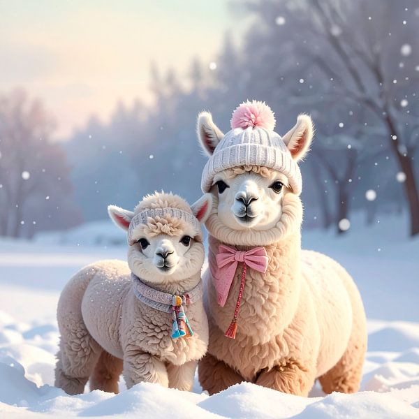 Zwei niedliche Alpakas, eine Mutter mit ihrem Fohlen, in einer verschneiten Landschaft, während die Schneeflocken herunterwirbeln. Sie haben Mützen, Schals und Kopfwärmer auf, um sich warm zu halten, was eigentlich nicht nötig ist, da sie ein dickes Fell haben. Sie haben süße kleine Schnauzen, mit denen sie kuscheln können. Das Bild…