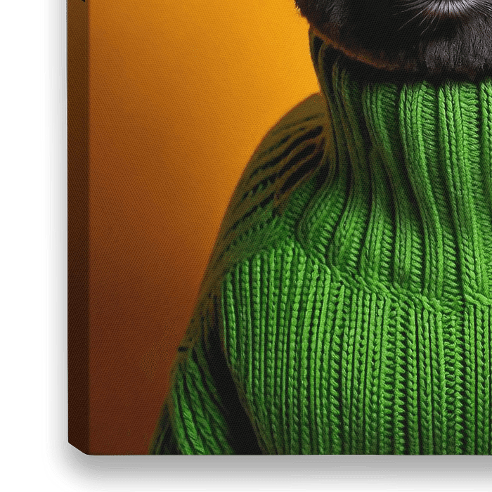 Das Bild zeigt ein schwarzes Alpaka mit einem ernsten, fast geheimnisvollen Blick, gekleidet in einen auffälligen hellgrünen Zopfpulli. Der Pullover scheint maßgeschneidert zu sein und ist eng um den Hals des Alpakas gewickelt, während sein flauschiges schwarzes Fell sanft um den Hals herum hervorlugt. Seine scharfen, neugierigen Augen…
