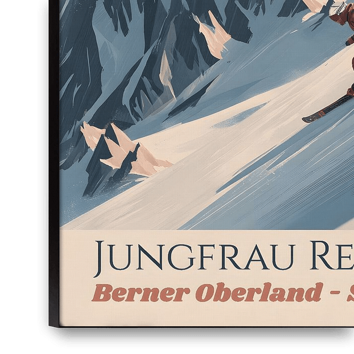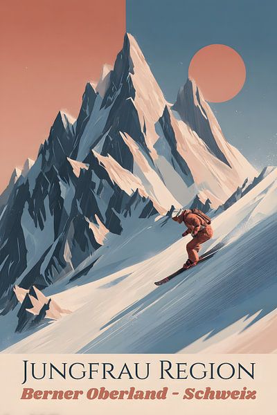 Eine stilisierte Hochgebirgslandschaft zeigt einen Skifahrer in dynamischer Abfahrt vor markanten, scharfkantigen Alpengipfeln. Die Szenerie ist reduziert, grafisch und erinnert an klassische Reiseplakate. Warme Akzente im Himmel kontrastieren mit kühlen Schnee- und Felsflächen.
