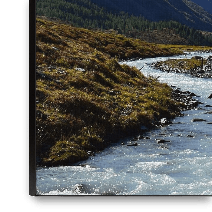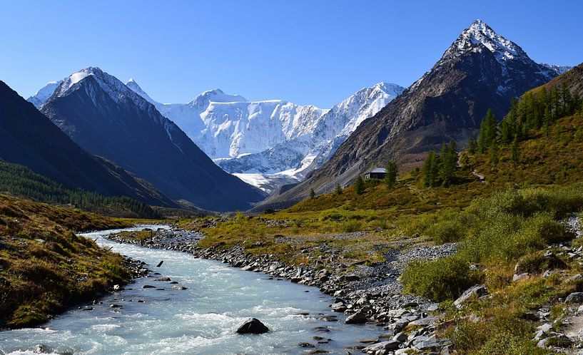 Der Fluss Ak-kem im gleichnamigen Tal, mit der Eiswand des Belucha im Hintergrund, der mit 4506 Metern der höchste Berg des Altaigebirges ist. Dieser Teil des Altaigebirges liegt in Südsibirien in Russland.
