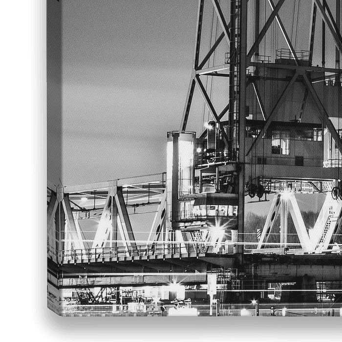 Nachtaufnahme in Schwarzweiß von der alten Botlek-Brücke im Hafen von Rotterdam.