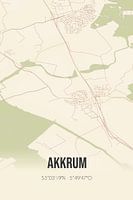 Retrokarte von Akkrum, gelegen in der Gemeinde Heerenveen, Provinz Fryslan. Die Karte zeigt öffentliche Straßen, Wasserläufe (Seen, Bäche und Gräben) und Wälder in und um Akkrum. Darüber hinaus enthält die Karte die Koordinaten von Akkrum.