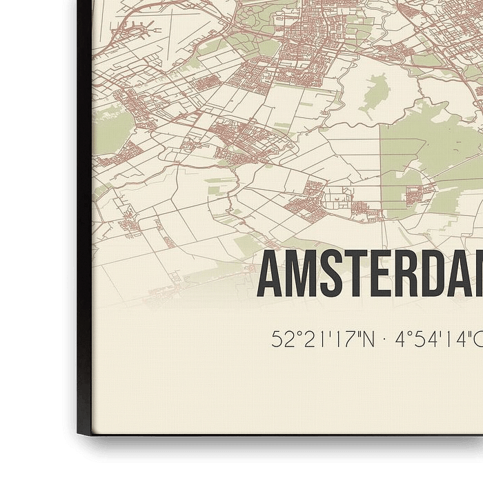 Retrokarte von Amsterdam, gelegen in der Randstad, in der Gemeinde Amsterdam, Provinz Nordholland. Die Karte zeigt öffentliche Straßen, Wasserläufe (Seen, Bäche und Gräben) und Wälder in und um Amsterdam. Darüber hinaus sind auf der Karte die Koordinaten von Amsterdam verzeichnet.