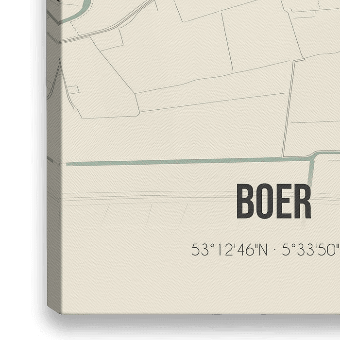Retrokarte von Boer, gelegen in der Gemeinde Waadhoeke, Provinz Fryslan. Die Karte zeigt öffentliche Straßen, Wasserläufe (Seen, Bäche und Gräben) und Wälder in und um Boer. Darüber hinaus enthält die Karte die Koordinaten von Boer.