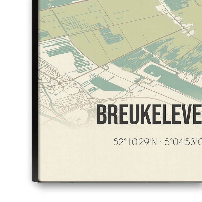 Retrokarte von Breukeleveen, gelegen in der Gemeinde Wijdemeren, Provinz Nordholland. Die Karte zeigt öffentliche Straßen, Wasserläufe (Seen, Bäche und Gräben) und Wälder in und um Breukeleveen. Darüber hinaus enthält die Karte die Koordinaten von Breukeleveen.