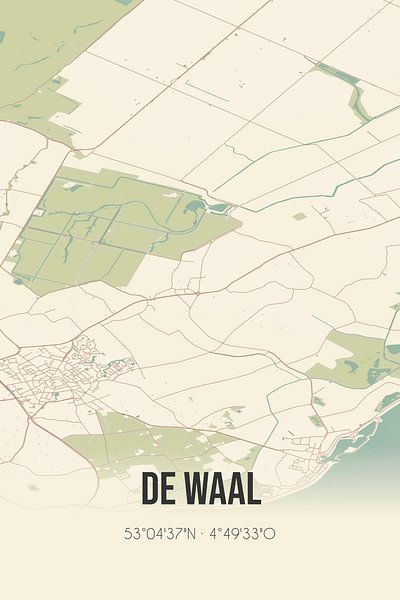 Retrokarte von De Waal, das auf den Watteninseln in der Gemeinde Texel in der Provinz Nordholland liegt. Die Karte zeigt öffentliche Straßen, Wasserläufe (Seen, Bäche und Gräben) und Wälder in und um De Waal. Darüber hinaus enthält die Karte die Koordinaten von De Waal.