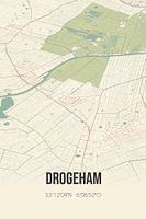 Retrokarte von Drogeham, gelegen in der Gemeinde Achtkarspelen, Provinz Fryslan. Die Karte zeigt öffentliche Straßen, Wasserläufe (Seen, Bäche und Gräben) und Wälder in und um Drogeham. Darüber hinaus enthält die Karte die Koordinaten von Drogeham.