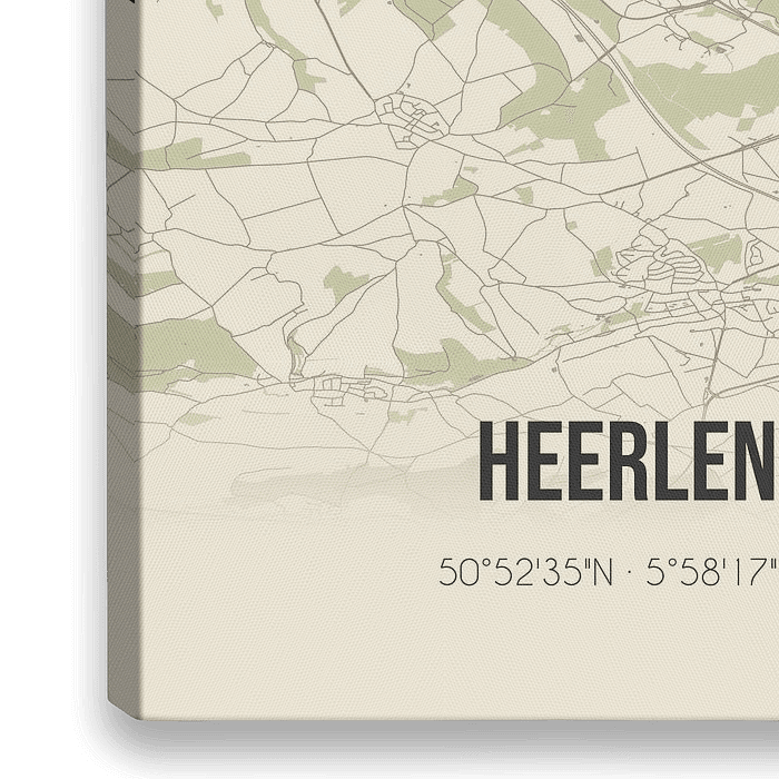 Retrokarte von Heerlen, gelegen in der Gemeinde Heerlen, Provinz Limburg. Die Karte zeigt öffentliche Straßen, Wasserläufe (Seen, Bäche und Gräben) und Wälder in und um Heerlen. Außerdem enthält die Karte die Koordinaten von Heerlen.