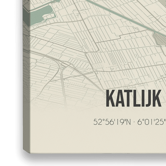 Retrokarte von Katlijk, gelegen in der Gemeinde Heerenveen, Provinz Fryslan. Die Karte zeigt öffentliche Straßen, Wasserläufe (Seen, Bäche und Gräben) und Wälder in und um Katlijk. Darüber hinaus enthält die Karte die Koordinaten von Katlijk.