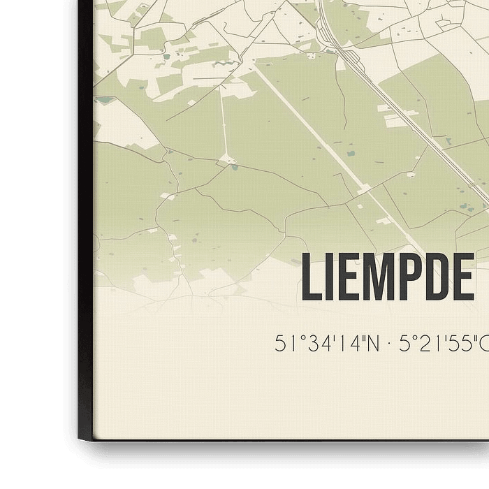 Retrokarte von Liempde, gelegen in der Gemeinde Boxtel, Provinz Nordbrabant. Die Karte zeigt öffentliche Straßen, Wasserläufe (Seen, Bäche und Gräben) und Wälder in und um Liempde. Darüber hinaus enthält die Karte die Koordinaten von Liempde.