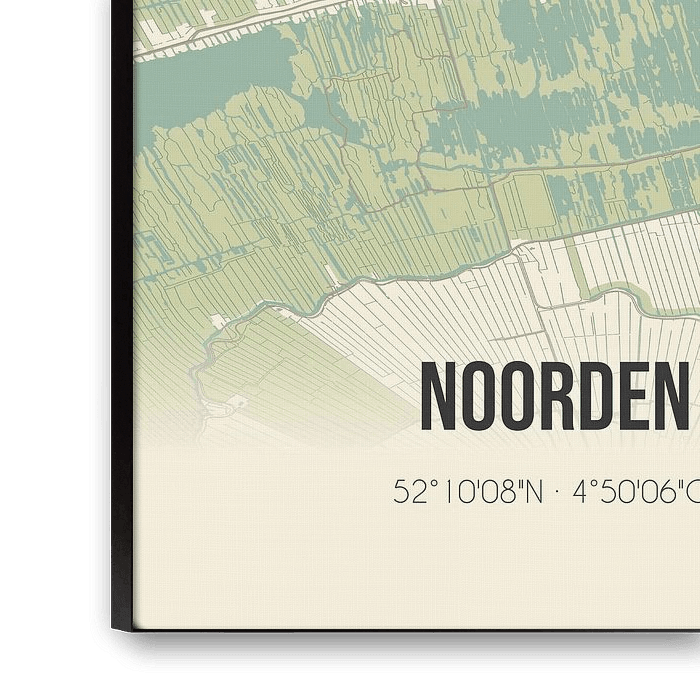Retrokarte von Noorden, gelegen in der Gemeinde Nieuwkoop, Provinz Zuid-Holland. Die Karte zeigt öffentliche Straßen, Wasserläufe (Seen, Bäche und Gräben) und Wälder in und um Noorden. Außerdem enthält die Karte die Koordinaten von Noorden.
