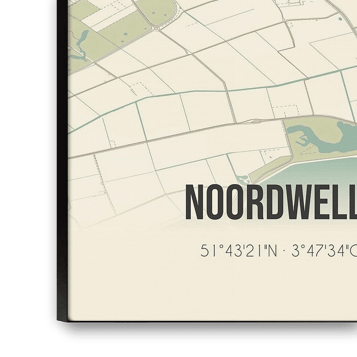 Retrokarte von Noordwelle, gelegen in der Gemeinde Schouwen-Duiveland, Provinz Zeeland. Die Karte zeigt öffentliche Straßen, Wasserläufe (Seen, Bäche und Gräben) und Wälder in und um Noordwelle. Darüber hinaus enthält die Karte die Koordinaten von Noordwelle.