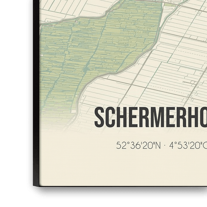 Retrokarte von Schermerhorn, gelegen in der Gemeinde Alkmaar, Provinz Nordholland. Die Karte zeigt öffentliche Straßen, Wasserläufe (Seen, Bäche und Gräben) und Wälder in und um Schermerhorn. Darüber hinaus enthält die Karte die Koordinaten von Schermerhorn.