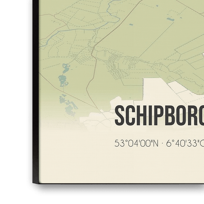 Retrokarte von Schipborg, gelegen in der Gemeinde Aa en Hunze, Provinz Drenthe. Die Karte zeigt öffentliche Straßen, Wasserläufe (Seen, Bäche und Gräben) und Wälder in und um Schipborg. Darüber hinaus enthält die Karte die Koordinaten von Schipborg.