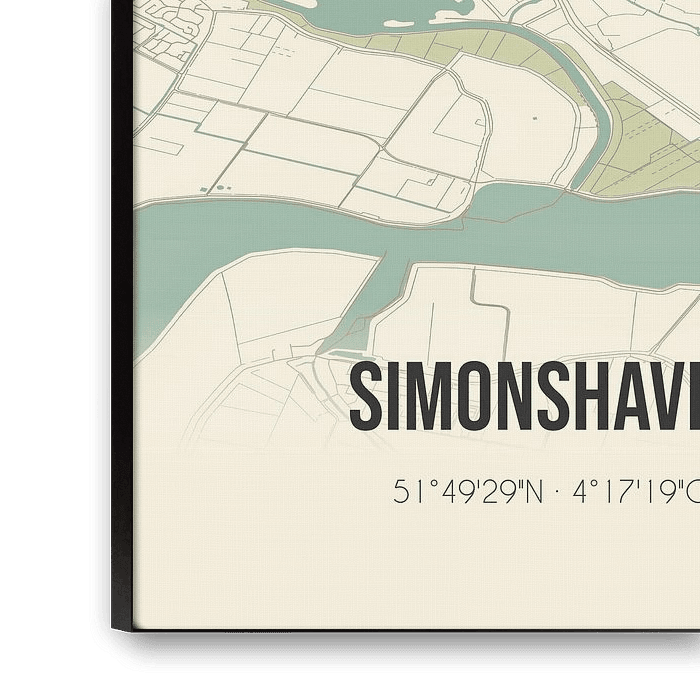 Retrokarte von Simonshaven, gelegen in der Gemeinde Nissewaard, Provinz Südholland. Die Karte zeigt öffentliche Straßen, Wasserläufe (Seen, Bäche und Gräben) und Wälder in und um Simonshaven. Darüber hinaus enthält die Karte die Koordinaten von Simonshaven.