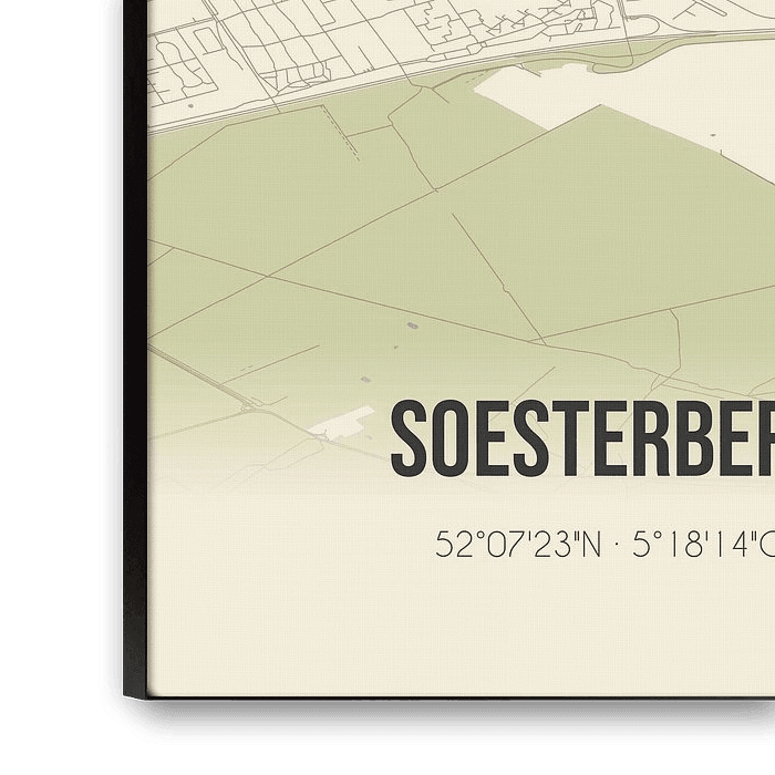 Retrokarte von Soesterberg, gelegen in der Region Gooi, in der Gemeinde Soest, Provinz Utrecht. Die Karte zeigt öffentliche Straßen, Wasserläufe (Seen, Bäche und Gräben) und Wälder in und um Soesterberg. Darüber hinaus enthält die Karte die Koordinaten von Soesterberg.