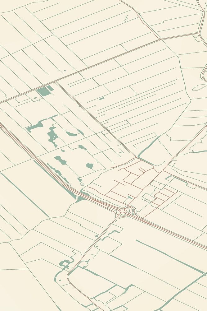 Retrokarte von Spierdijk, gelegen in der Gemeinde Koggenland, Provinz Nordholland. Die Karte zeigt öffentliche Straßen, Wasserläufe (Seen, Bäche und Gräben) und Wälder in und um Spierdijk. Darüber hinaus enthält die Karte die Koordinaten von Spierdijk.