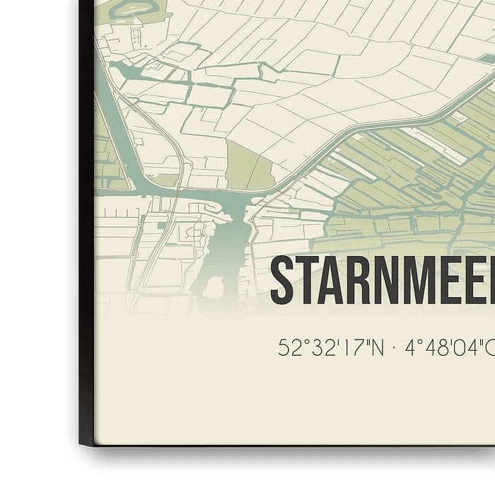 Retrokarte von Starnmeer, gelegen in der Gemeinde Alkmaar, Provinz Nordholland. Die Karte zeigt öffentliche Straßen, Wasserläufe (Seen, Bäche und Gräben) und Wälder in und um Starnmeer. Darüber hinaus enthält die Karte die Koordinaten von Starnmeer.