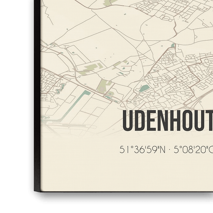 Retrokarte von Udenhout, gelegen in der Gemeinde Tilburg, Provinz Nordbrabant. Die Karte zeigt öffentliche Straßen, Wasserläufe (Seen, Bäche und Gräben) und Wälder in und um Udenhout. Darüber hinaus enthält die Karte die Koordinaten von Udenhout.