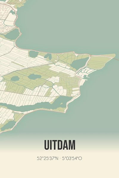 Retrokarte von Uitdam, gelegen in der Gemeinde Waterland, Provinz Nordholland. Die Karte zeigt öffentliche Straßen, Wasserläufe (Seen, Bäche und Gräben) und Wälder in und um Uitdam. Darüber hinaus enthält die Karte die Koordinaten von Uitdam.