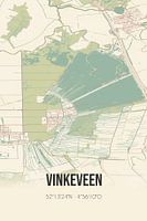 Retrokarte von Vinkeveen, gelegen in der Gemeinde De Ronde Venen, Provinz Utrecht. Die Karte zeigt öffentliche Straßen, Wasserläufe (Seen, Bäche und Gräben) und Wälder in und um Vinkeveen. Darüber hinaus zeigt die Karte die Koordinaten von Vinkeveen.