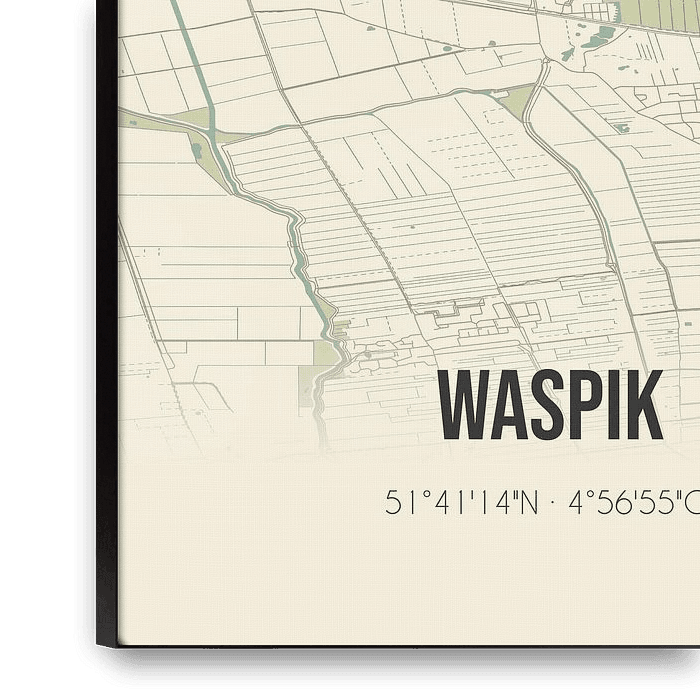 Retrokarte von Waspik, gelegen in der Gemeinde Waalwijk, Provinz Nordbrabant. Die Karte zeigt öffentliche Straßen, Wasserläufe (Seen, Bäche und Gräben) und Wälder in und um Waspik. Darüber hinaus enthält die Karte die Koordinaten von Waspik.