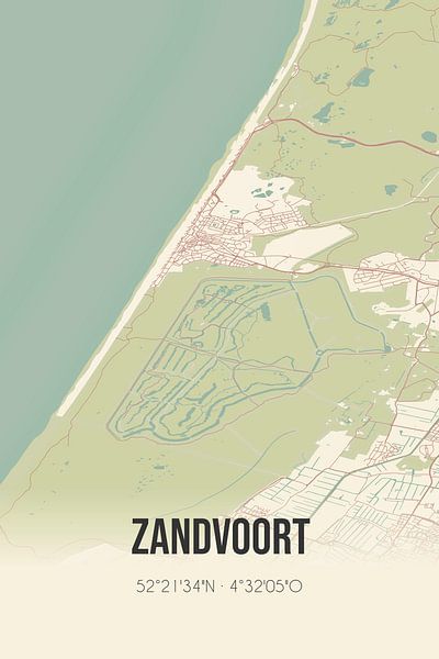 Retrokarte von Zandvoort, gelegen in der Randstad, in der Gemeinde Zandvoort, Provinz Nordholland. Die Karte zeigt öffentliche Straßen, Wasserläufe (Seen, Bäche und Gräben) und Wälder in und um Zandvoort. Darüber hinaus enthält die Karte die Koordinaten von Zandvoort.