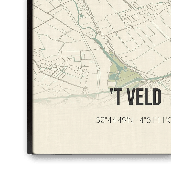 Retrokarte von 't Veld, gelegen in der Gemeinde Hollands Kroon, Provinz Nordholland. Die Karte zeigt öffentliche Straßen, Wasserläufe (Seen, Bäche und Gräben) und Wälder in und um 't Veld. Darüber hinaus enthält die Karte die Koordinaten von 't Veld.