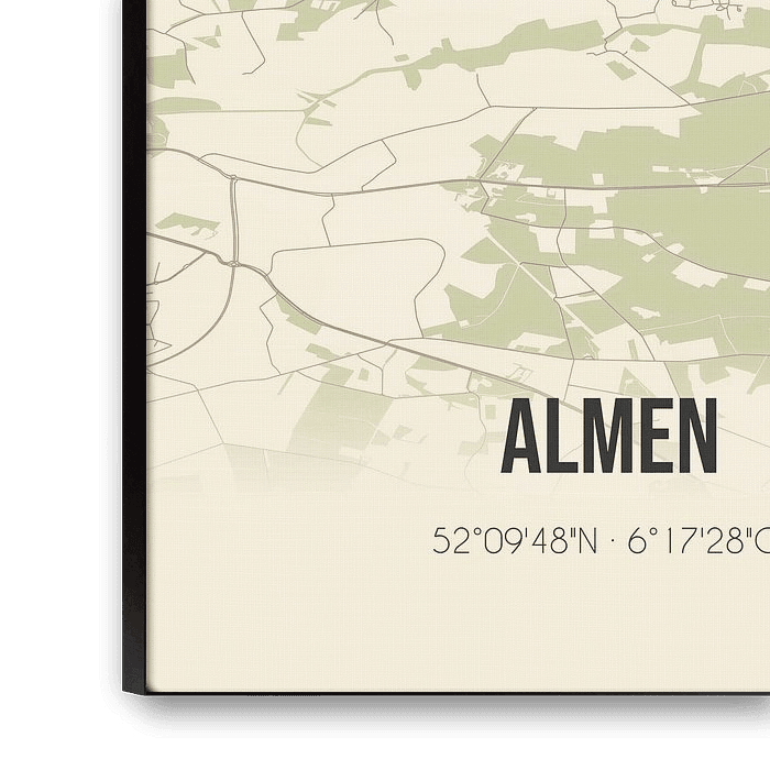 Retrokarte von Almen, gelegen in der Achterhoek, in der Gemeinde Lochem, Provinz Gelderland. Die Karte zeigt öffentliche Straßen, Wasserläufe (Seen, Bäche und Gräben) und Wälder in und um Almen. Darüber hinaus enthält die Karte die Koordinaten von Almen.