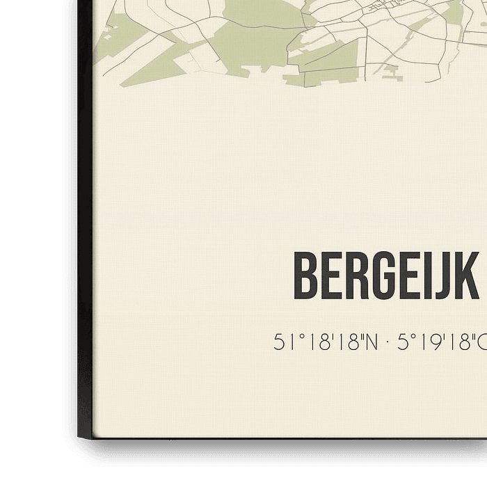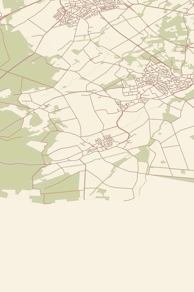 Retrokarte von Bergeijk, gelegen in der Gemeinde Bergeijk, Provinz Nordbrabant. Die Karte zeigt öffentliche Straßen, Wasserläufe (Seen, Bäche und Gräben) und Wälder in und um Bergeijk. Darüber hinaus enthält die Karte die Koordinaten von Bergeijk.