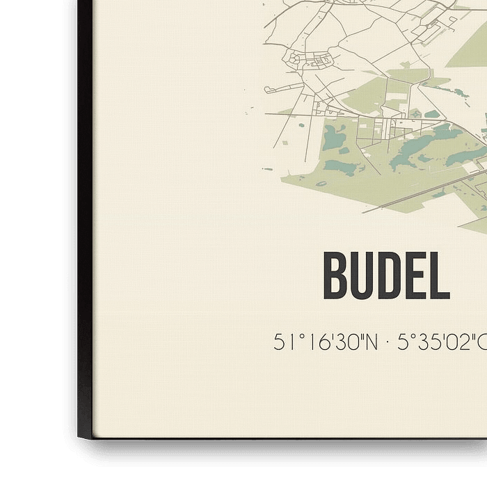 Retrokarte von Budel, gelegen in der Gemeinde Cranendonck, Provinz Nordbrabant. Die Karte zeigt öffentliche Straßen, Wasserläufe (Seen, Bäche und Gräben) und Wälder in und um Budel. Darüber hinaus enthält die Karte die Koordinaten von Budel.