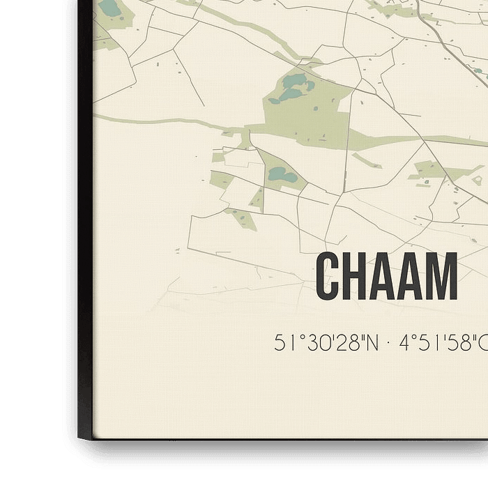Retrokarte von Chaam, gelegen in der Gemeinde Alphen-Chaam, Provinz Nordbrabant. Die Karte zeigt öffentliche Straßen, Wasserläufe (Seen, Bäche und Gräben) und Wälder in und um Chaam. Darüber hinaus enthält die Karte die Koordinaten von Chaam.