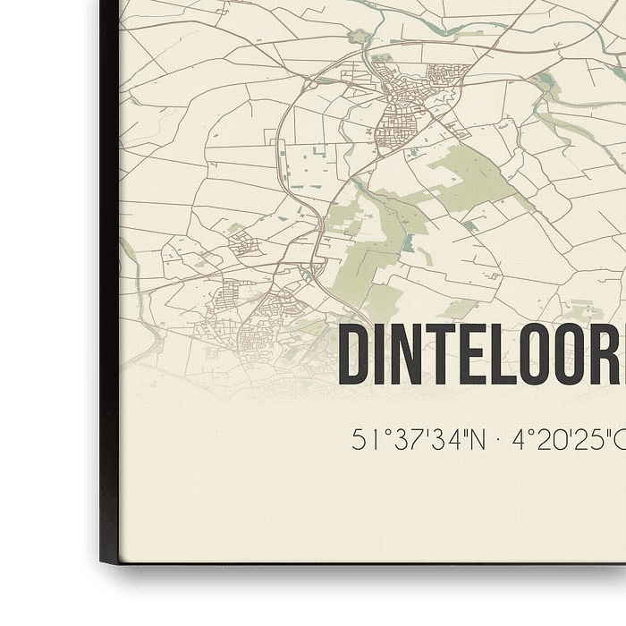 Retrokarte von Dinteloord, gelegen in der Gemeinde Steenbergen, Provinz Nordbrabant. Die Karte zeigt öffentliche Straßen, Wasserläufe (Seen, Bäche und Gräben) und Wälder in und um Dinteloord. Darüber hinaus enthält die Karte die Koordinaten von Dinteloord.