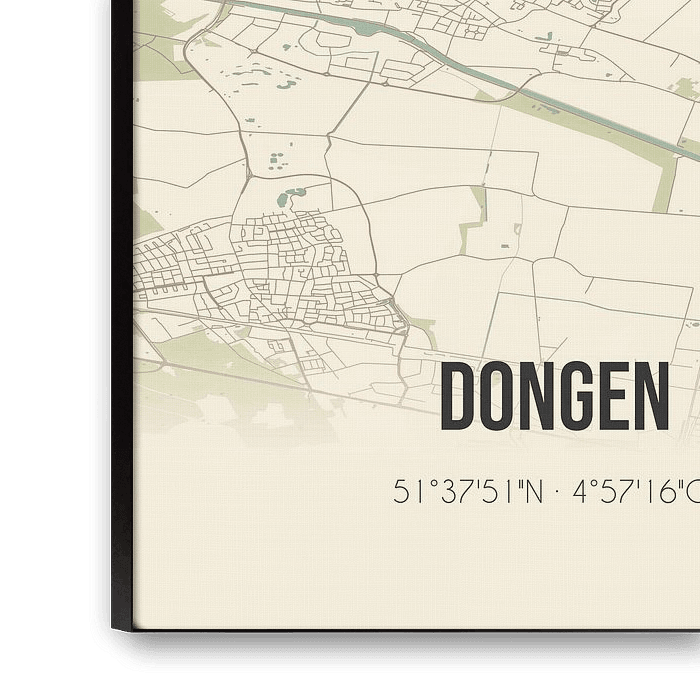 Retrokarte von Dongen, gelegen in der Gemeinde Dongen, Provinz Nordbrabant. Die Karte zeigt öffentliche Straßen, Wasserläufe (Seen, Bäche und Gräben) und Wälder in und um Dongen. Darüber hinaus enthält die Karte die Koordinaten von Dongen.