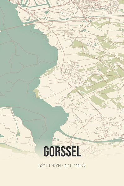 Retrokarte von Gorssel, gelegen in der Achterhoek, in der Gemeinde Lochem, Provinz Gelderland. Die Karte zeigt öffentliche Straßen, Wasserläufe (Seen, Bäche und Gräben) und Wälder in und um Gorssel. Darüber hinaus enthält die Karte die Koordinaten von Gorssel.