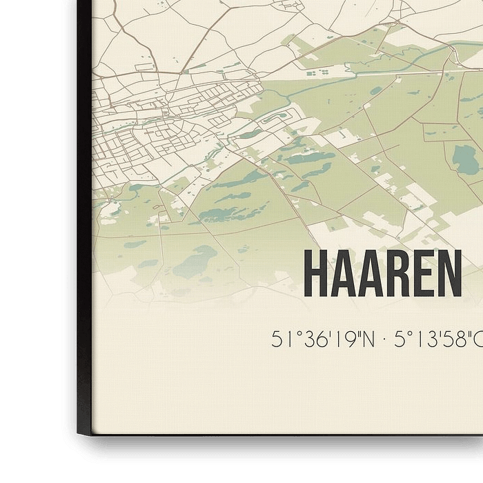 Retrokarte von Haaren, gelegen in der Gemeinde Haaren, Provinz Nordbrabant. Die Karte zeigt öffentliche Straßen, Wasserläufe (Seen, Bäche und Gräben) und Wälder in und um Haaren. Darüber hinaus enthält die Karte die Koordinaten von Haaren.