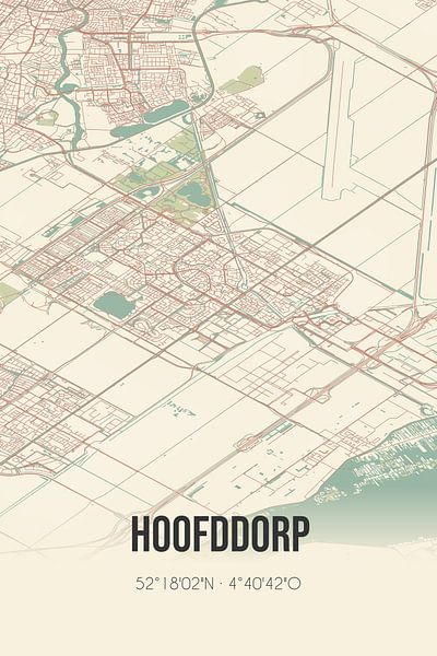 Retrokarte von Hoofddorp, in der Gemeinde Haarlemmermeer, Provinz Nordholland gelegen. Die Karte zeigt öffentliche Straßen, Wasserläufe (Seen, Bäche und Gräben) und Wälder in und um Hoofddorp. Außerdem enthält die Karte die Koordinaten von Hoofddorp.