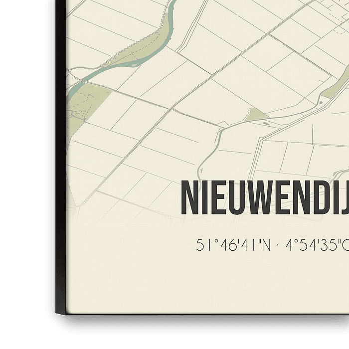 Retrokarte von Nieuwendijk, gelegen in der Gemeinde Altena, Provinz Nordbrabant. Die Karte zeigt öffentliche Straßen, Wasserläufe (Seen, Bäche und Gräben) und Wälder in und um Nieuwendijk. Darüber hinaus enthält die Karte die Koordinaten von Nieuwendijk.