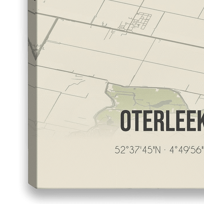 Retrokarte von Oterleek, gelegen in der Gemeinde Alkmaar, Provinz Nordholland. Die Karte zeigt öffentliche Straßen, Wasserläufe (Seen, Bäche und Gräben) und Wälder in und um Oterleek. Darüber hinaus enthält die Karte die Koordinaten von Oterleek.
