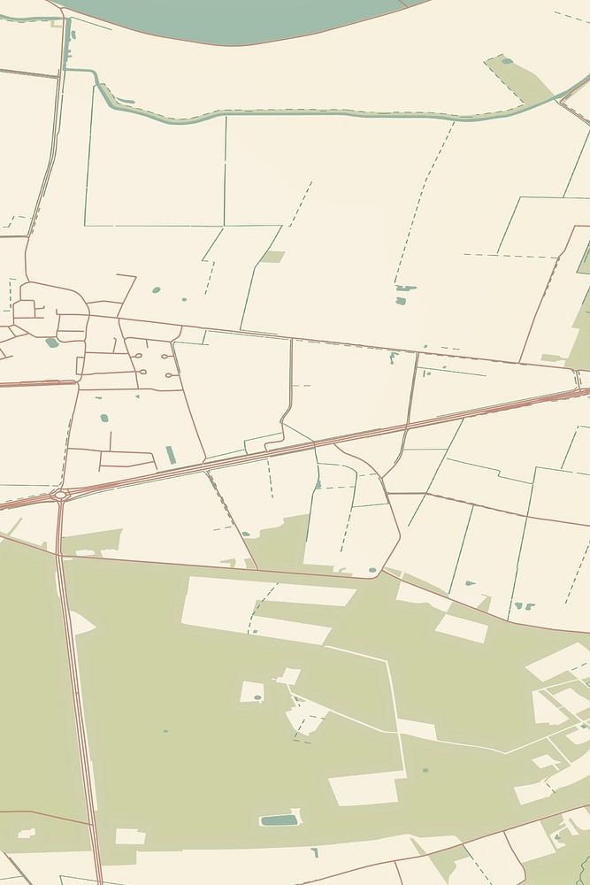 Retrokarte von Reek, gelegen in der Gemeinde Landerd, Provinz Nordbrabant. Die Karte zeigt öffentliche Straßen, Wasserläufe (Seen, Bäche und Gräben) und Wälder in und um Reek. Darüber hinaus enthält die Karte die Koordinaten von Reek.