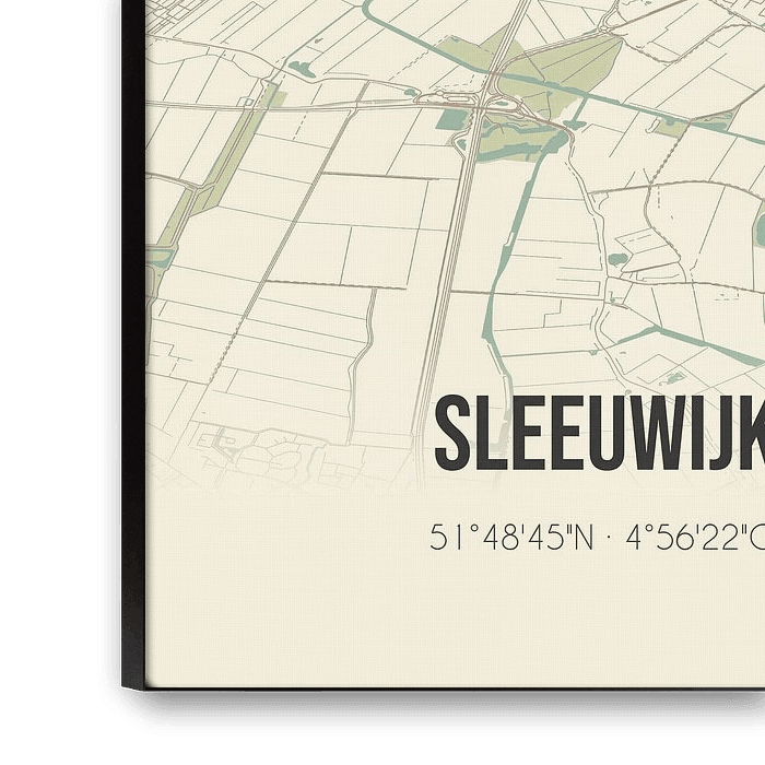 Retrokarte von Sleeuwijk, gelegen in der Gemeinde Altena, Provinz Nordbrabant. Die Karte zeigt öffentliche Straßen, Wasserläufe (Seen, Bäche und Gräben) und Wälder in Sleeuwijk und Umgebung. Darüber hinaus enthält die Karte die Koordinaten von Sleeuwijk.