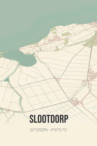 Retrokarte von Slootdorp, gelegen in der Gemeinde Hollands Kroon, Provinz Nordholland. Die Karte zeigt öffentliche Straßen, Wasserläufe (Seen, Bäche und Gräben) und Wälder in und um Slootdorp. Darüber hinaus enthält die Karte die Koordinaten von Slootdorp.