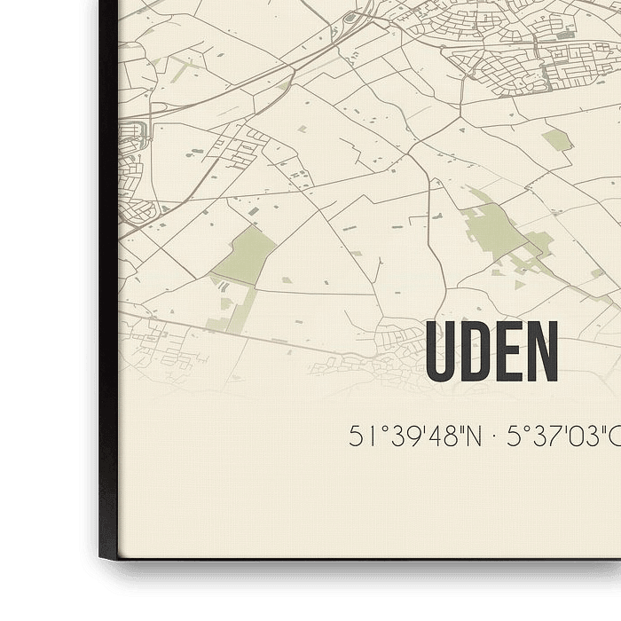 Retrokarte von Uden, gelegen in der Gemeinde Uden, Provinz Nordbrabant. Die Karte zeigt öffentliche Straßen, Wasserläufe (Seen, Bäche und Gräben) und Wälder in und um Uden. Außerdem enthält die Karte die Koordinaten von Uden.