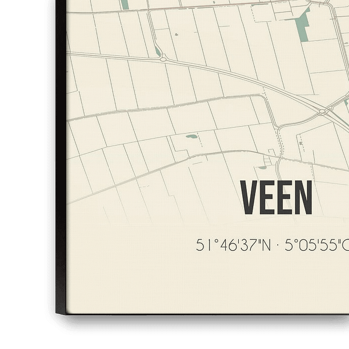 Retrokarte von Veen, gelegen in der Gemeinde Altena, Provinz Nordbrabant. Die Karte zeigt öffentliche Straßen, Wasserläufe (Seen, Bäche und Gräben) und Wälder in und um Veen. Darüber hinaus enthält die Karte die Koordinaten von Veen.