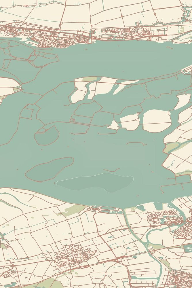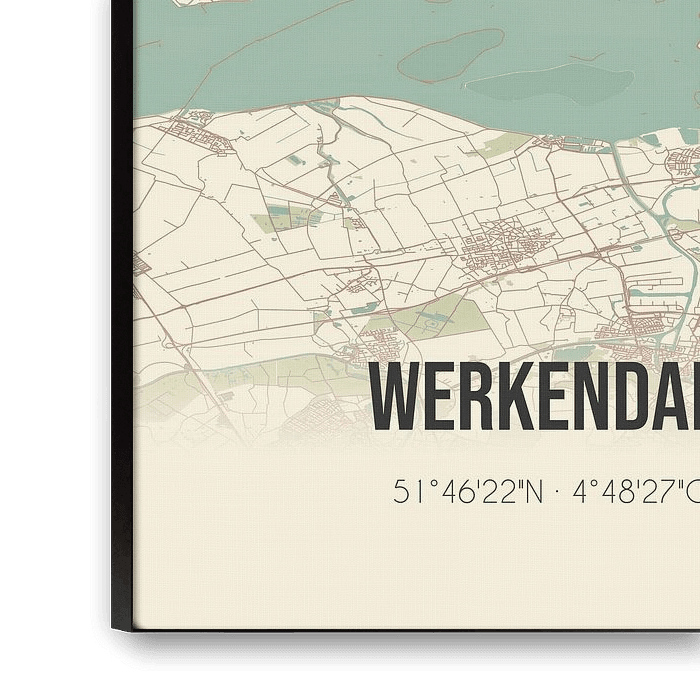 Retrokarte von Werkendam, gelegen in der Gemeinde Altena, Provinz Nordbrabant. Die Karte zeigt öffentliche Straßen, Wasserläufe (Seen, Bäche und Gräben) und Wälder in und um Werkendam. Darüber hinaus enthält die Karte die Koordinaten von Werkendam.