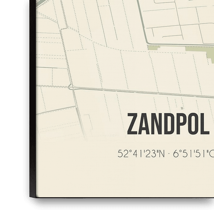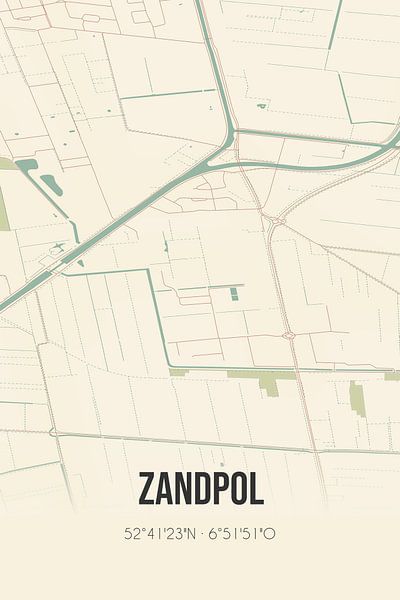Retrokarte von Zandpol, gelegen in der Gemeinde Emmen, Provinz Drenthe. Die Karte zeigt öffentliche Straßen, Wasserläufe (Seen, Bäche und Gräben) und Wälder in und um Zandpol. Darüber hinaus enthält die Karte die Koordinaten von Zandpol.